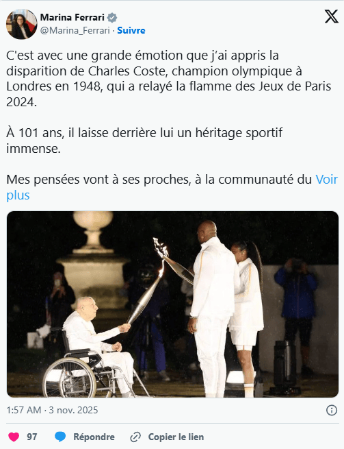 对于查尔斯·科斯特的逝世,法国体育部长玛丽娜·费拉里(Marina Ferrari)正在社交上发文致敬,称他“留下了庞大的体育遗产”。