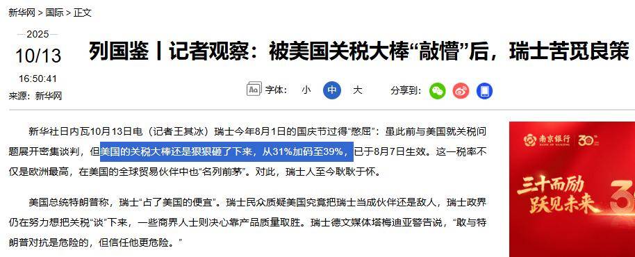 美国同样正在察看欧盟的动向,对于没怀孕处欧盟的国度——瑞士,美国没有手下留情,间接暗示要对瑞士加征,而税额同比添加高达31%。到了几个月之后的8月份,税额再次提高8%。