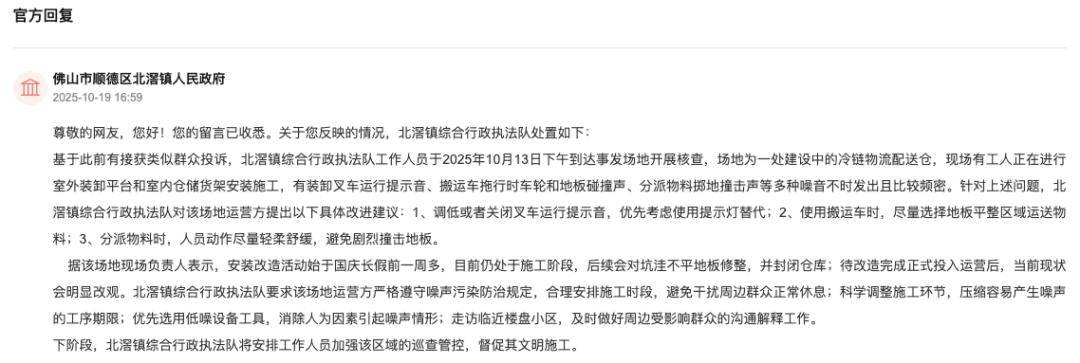 对此,北滘镇分析行政法律队回应指出,北滘镇分析行政法律队工做人员于2025年10月13日下战书达到事发场地开展核查,场地为一处扶植中的冷链物流配送仓,现场有工人正正在进行室外拆卸平台和室内仓储货架安拆施工,有拆卸叉车运转提醒音、搬运车拖行时车轮和地板碰撞声、物料抛地撞击声等多种乐音不时发出且比力频密。针对上述问题,北滘镇分析行政法律队对该场地运营方提出以下具体改良:1、调低或者封闭叉车运转提醒音,优先考虑利用提醒灯替代;2、利用搬运车时,尽量选择地板平整区域运送物料;3、物料时,人员动做尽量温柔舒缓,避免猛烈撞击地板。据该场地现场担任人暗示,安拆勾当始于国庆长假前一周多,目前仍处于施工阶段,后续会对坑洼不服地板修整,并封锁仓库;待完成正式投入运营后,当前现状会较着改不雅。