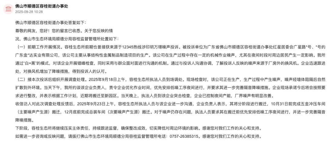 对此,佛山市生态局顺德容桂监视办理所回应指出,被赞扬单元次要处置布局性金属成品制制项目标出产。该公司正在出产过程中存正在必然的机械功课噪声,特别正在夜间时段对周边居平易近发生必然影响。我所通过“白+黑”的模式,对该企业开展错峰查抄,同时采用取群众面临面进行沟通的机制。通过取赞扬人沟通协调,领会赞扬人反映的噪声来历于厂房外的换风机。企业敏捷跟进处,对调风机添加了降噪办法,获得赞扬人的承认。此外,我所还约谈该企业担任人,责令企业优化功课时间,优先放置低噪工序夜间进行,并要求其进一步完美隔音降噪办法。企业现场许诺此后将会按照要求进行整改,并暗示按照工做打算,近期将搬家至新园区。