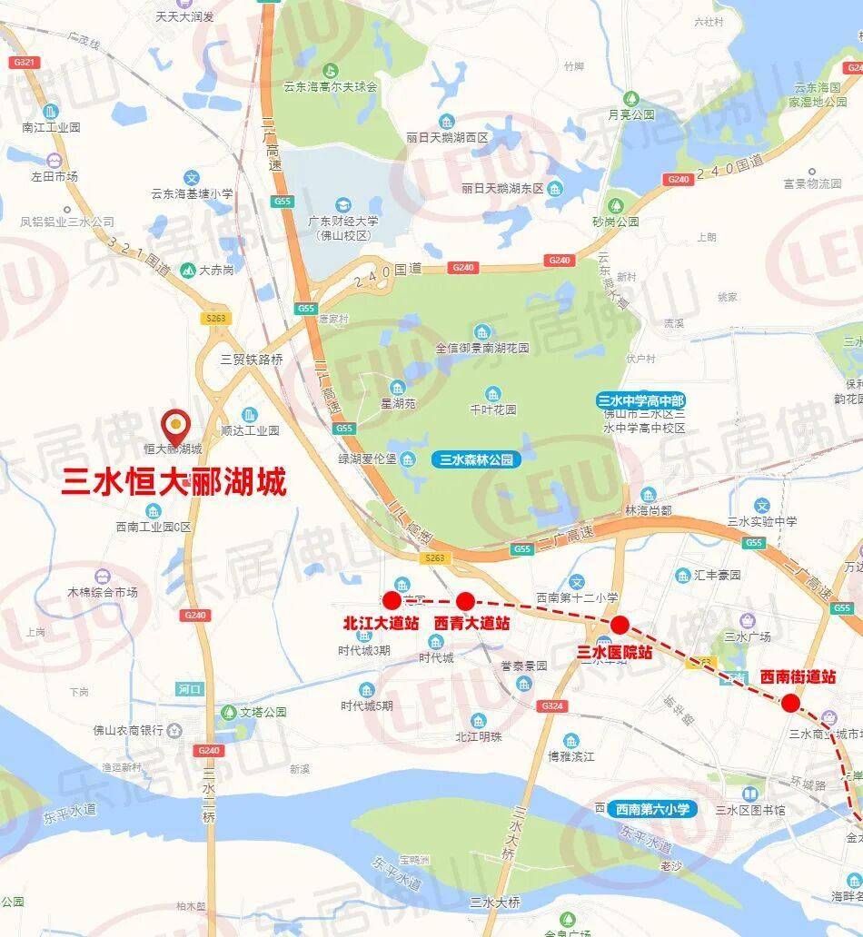 从地图可见,三水恒大郦湖城就位于三水西南西部片区,地处碧云沿线,从北向南稠密分布了金盛西南耕牛市场无限公司、佛山市三水科伦纸业无限公司、鹏丰金属成品公司、新景泰细密机械等,可谓厂区环抱。