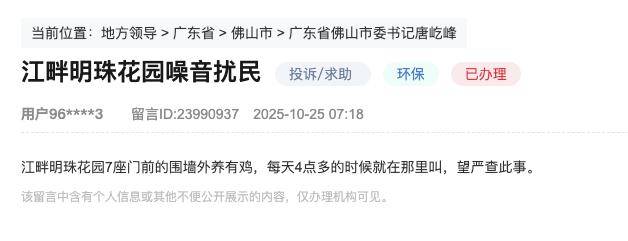 10月25日,有网友正在人平易近网带领留言板上赞扬暗示,江干明珠花圃7座门前的围墙外养有鸡,每天4点多的时候就正在那里叫,望严查此事。