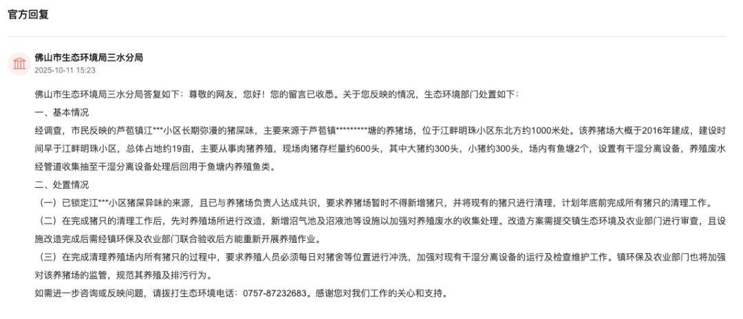 该养猪场大要于2016年建成,扶植时间早于江干明珠小区,总体占地约19亩,次要处置肉猪养殖,现场肉猪存栏量约600头,此中大猪约300头,小猪约300头,场内有鱼塘2个,设置有干湿分手设备,养殖废水经管道收集抽至干湿分手设备处置后回用于鱼塘内养殖鱼类。措置方面,既已锁定来历,佛山市生态局三水暗示已取养猪场担任人告竣共识,要求养猪场临时不得新增猪只,并将现有的猪只进行清理,打算岁尾前完成所有猪只的清理工做。正在完成猪只的清理工做后,先对养殖场合进行,新增沼气池及沼液池等设备以加强对养殖废水的收集处置。且设备完成后需经镇环保及农业部分结合验收后方能从头开展养殖功课。此外,正在完成清理养殖场内所有猪只的过程中,还要求养殖人员必需每日对猪舍等进行冲刷,加强对现有干湿分手设备的运转及查抄工做。镇环保及农业部分也将加强对该养猪场的监管,规范其养殖及排污行为。